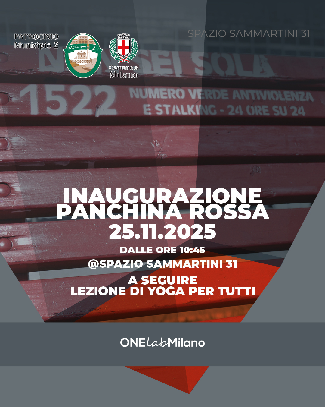 25/11 - alle 10:45 - Lo Sport contro la violenza sulle donne - inaugurazione panchina rossa seguita da lezione yoga gratuita - Campo da basket, Spazio Sammartini 31