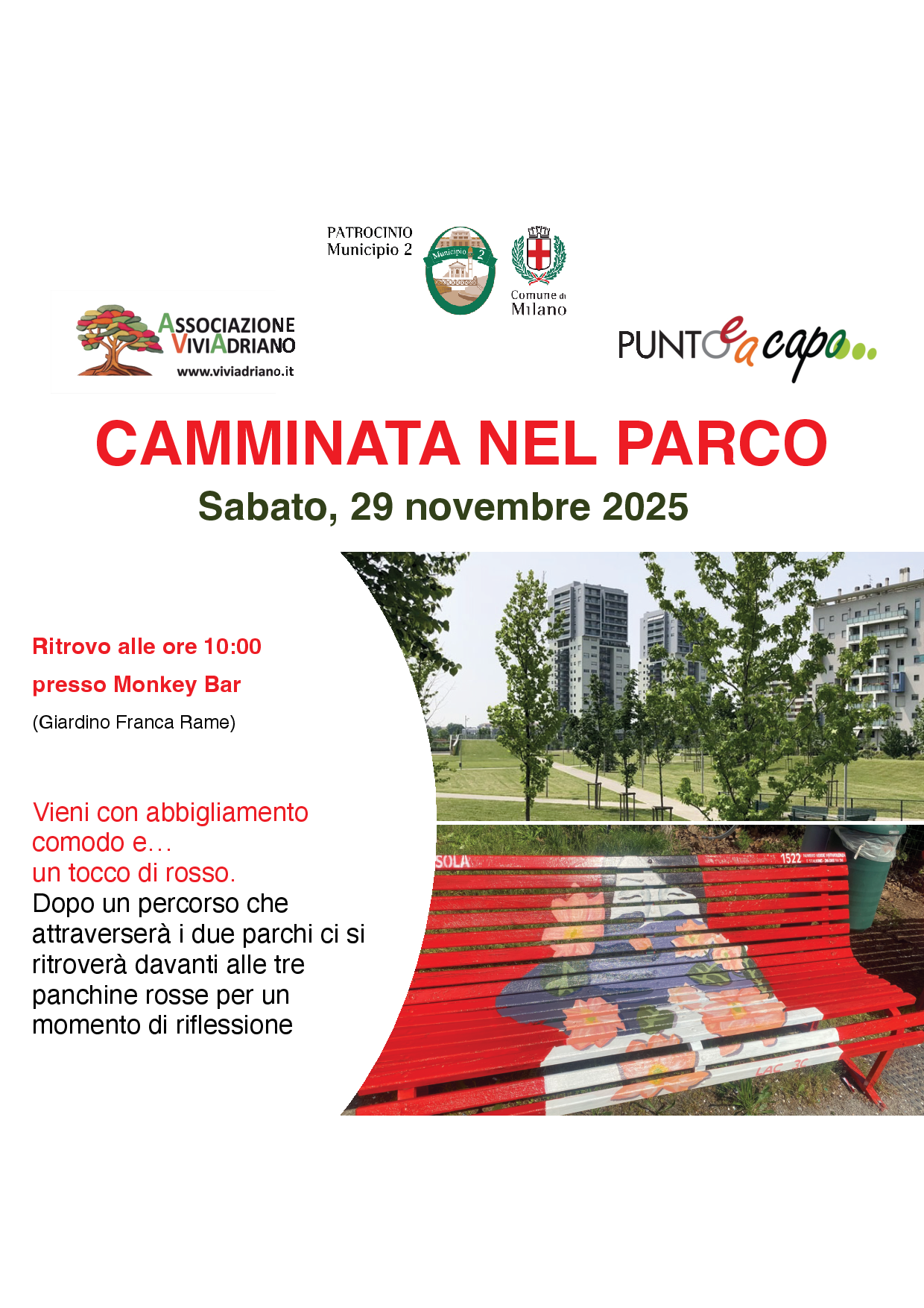 29/11 - alle 10:00 - Camminata nel parco - tour delle panchine rosse per un momento di riflessione sul tema, dal giardino Franca Rame al parco Mondaini e Vianello