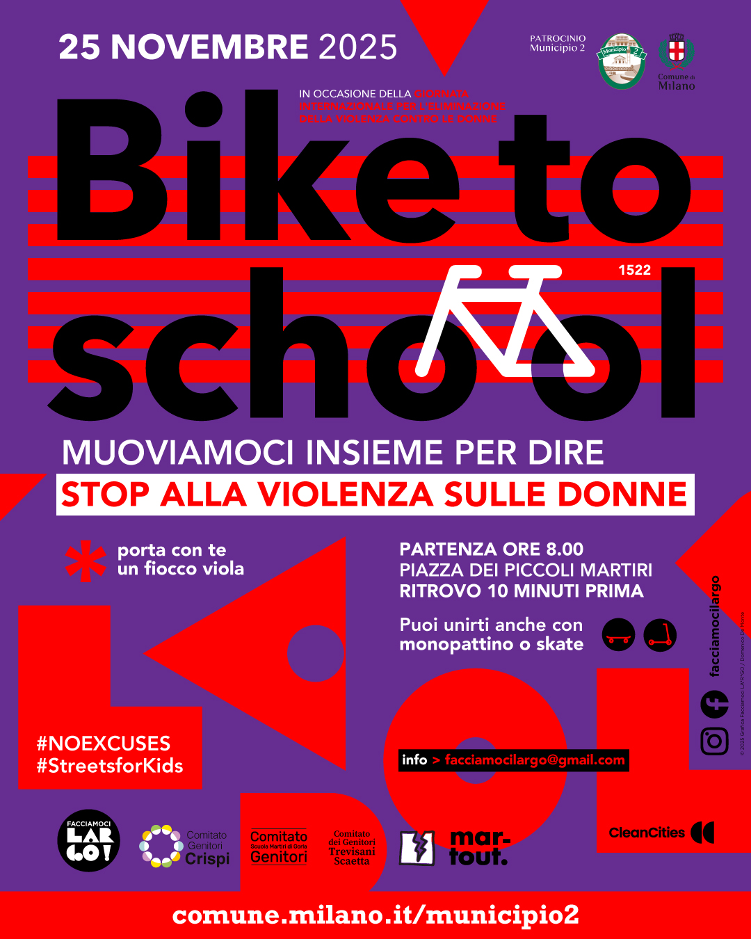 25/11 - alle 07:50 - Bike to school - biciclettata di bambini e accompagnatori, da piazza Piccoli Martiri alle scuole Martiri di Gorla e Crespi/Villa Finzi