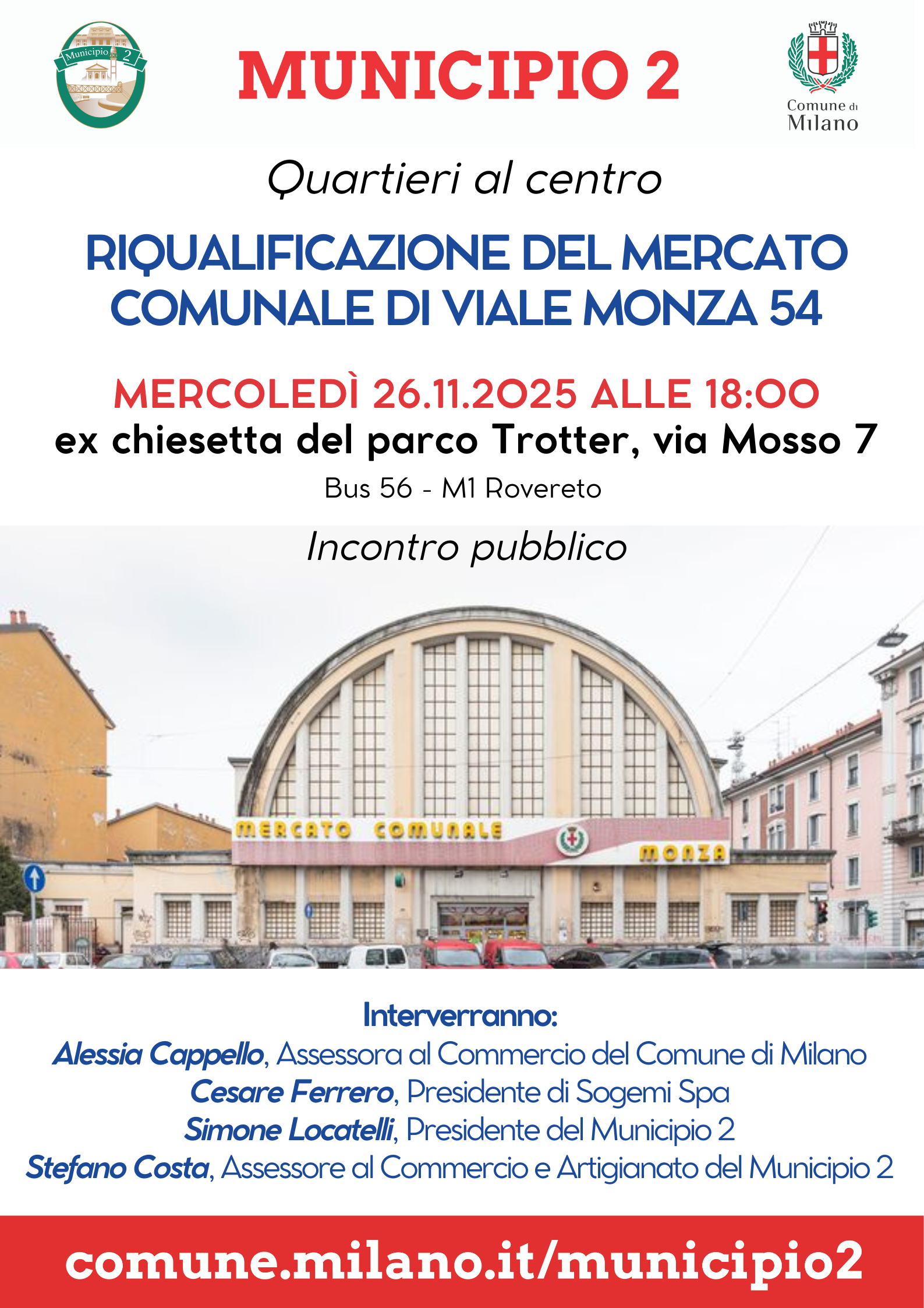 Mercoledì 26 novembre 2025 alle ore 18:00, presso l'ex chiesetta del parco Trotter di via Mosso 7, si svolgerà l'incontro pubblico per parlare della riqualificazione del mercato comunale di viale Monza 54, con: